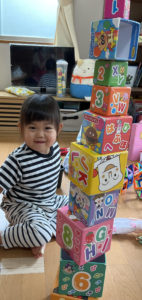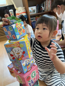 アンパンマンの箱をそーっとそーっと乗せて…